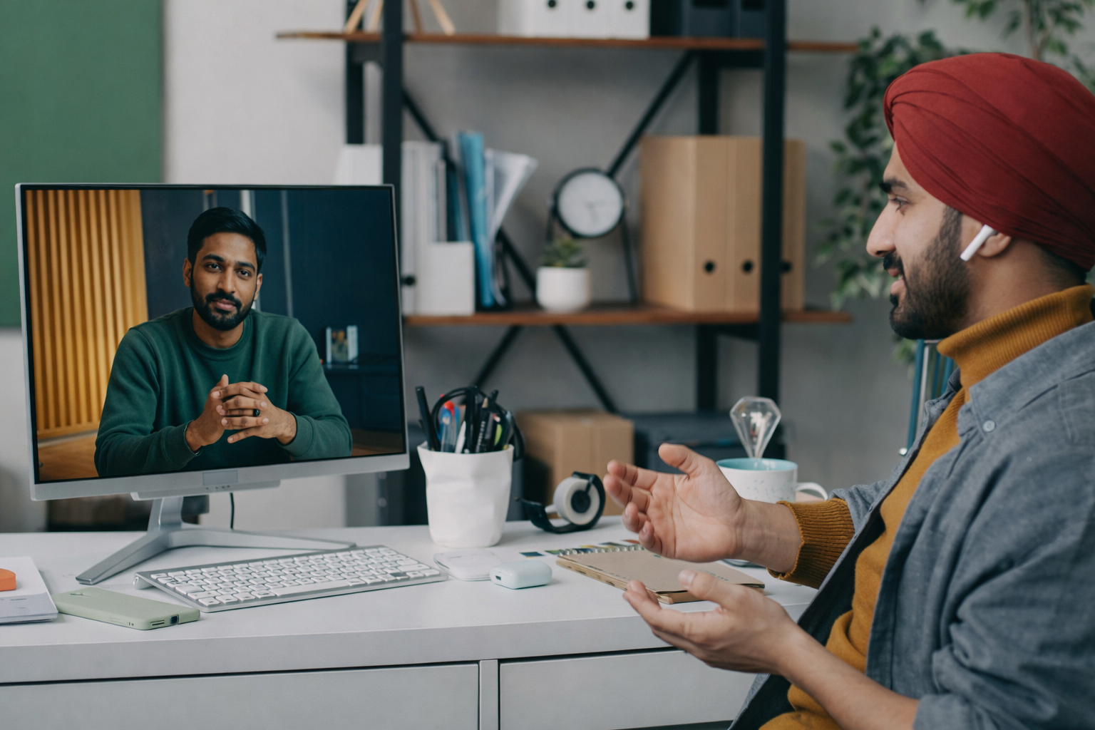 A person participates in a video call from their home workspace. Remote work solutions help save time while maintaining strong productivity.